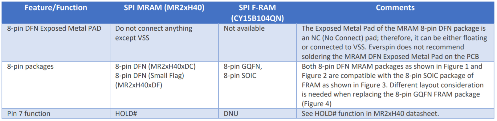 MR2xH40xDF是組織為512Kx8的4Mb非易失性RAM,采用標(biāo)稱3.3V電源供電,并且與FRAM兼容。它提供標(biāo)準(zhǔn)的8引腳小標(biāo)志DFN(DF版)和8引腳DFN(DC版),它們是多功能封裝選項(xiàng),可以用SPI-FRAM8引腳SOIC和8引腳GQFN替代它。包(表1)。從硬件的角度來看,關(guān)鍵的區(qū)別在于用于封裝引腳(引腳7)的PCB的變化。從軟件的角度來看,這兩個(gè)設(shè)備之間的主要區(qū)別在于引腳7的功能和設(shè)備ID。當(dāng)主機(jī)CPU必須中斷存儲(chǔ)器時(shí),使用MR2xH40xDF的HOLD#引腳(引腳7)另一個(gè)任務(wù)的操作。當(dāng)HOLD#為L(zhǎng)OW時(shí),當(dāng)前操作被掛起。設(shè)備將忽略SCK或CS#上的任何過渡。當(dāng)SCK為低電平時(shí),必須在HOLD#上進(jìn)行所有轉(zhuǎn)換。如果不使用,此引腳必須連接到VDD。可能需要更改硬件和軟件才能在MRAM上啟用HOLD#功能。
