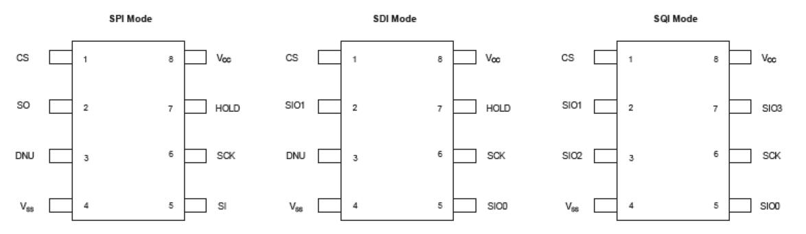 與兼容的主設備一起使用時,該設備還支持SDI(串行雙接口)和SQI(串行四接口)操作模式。要進入SDI模式,必須輸入ESDI命令(3Bh)。按照SDI操作模式的慣例,每個時鐘使用SIO0和SIO1引腳輸入兩位。位首先以MSB時鐘輸入。要進入SQI模式,必須輸入ESQI命令(38h)。對于SQI操作模式,每個時鐘輸入4位數據,或者每個時鐘輸入1個半字節。半字節首先由MSB提供時鐘。
