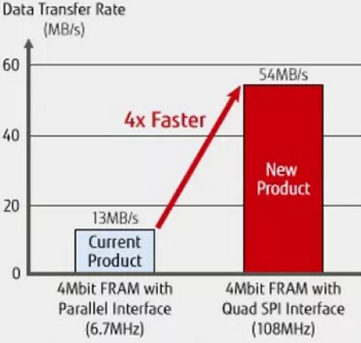 MB85RQ4ML采用Quad SPI接口,1.8V供電電壓,在108MHz工作頻率下數(shù)據(jù)傳輸速率可達54MB/s。在該產品發(fā)布之前,具有16個I/O引腳并行接口的4Mbit FRAM是最快的FRAM,具有13MB/s的數(shù)據(jù)傳輸速度。