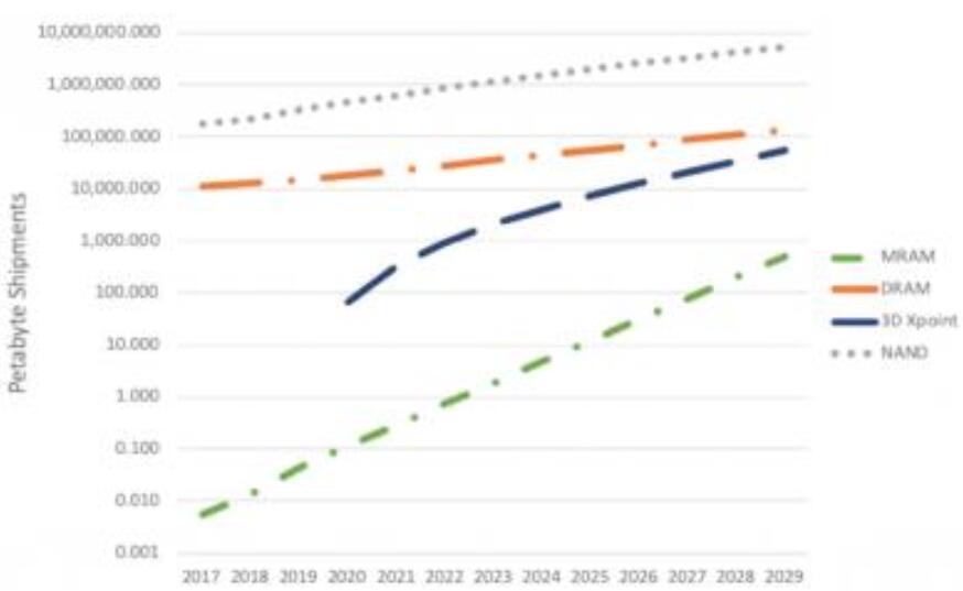 MRAM容量出貨量預(yù)測(cè)(2017-2029,Coughlin)分析人士預(yù)計(jì),包括DRAM,3DXpoint和NAND在內(nèi)的許多存儲(chǔ)技術(shù)將在未來(lái)幾年內(nèi)增長(zhǎng),但增長(zhǎng)最快的將是MRAM存儲(chǔ)器。容量方面的出貨量預(yù)計(jì)將從2019年的約0.1PB增長(zhǎng)到2029年的近100PB。