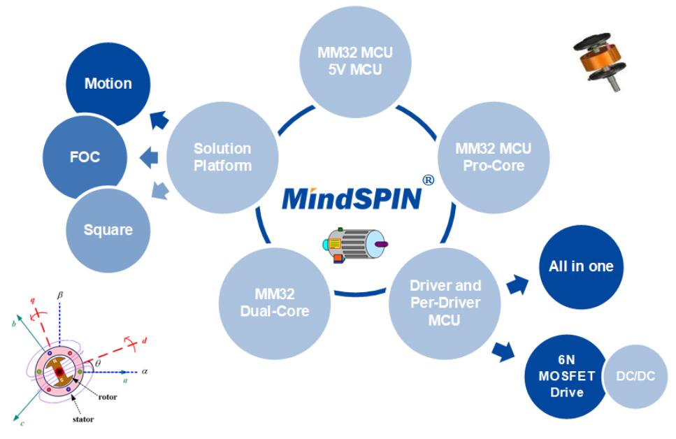 SPIN是旋轉(zhuǎn)的同義詞,再注入靈動微電子的靈魂Mind,表示靈活與專業(yè)。包含了三大主軸:專業(yè)MCU,專用驅(qū)動MCU微控制器及解決方案平臺。專用MCU的獨特之處是帶領(lǐng)了許多主流應用,如:電動車的應用,目前市場的占有率仍然保持領(lǐng)先地位;專用驅(qū)動型MCU微控制器電壓范圍從20V至600V。例:MM32SPIN222C集成了三相MOSFET、預驅(qū)以及LDO,可讓小空間發(fā)揮最大的功能,同時內(nèi)建了高性能32位的Arm Cortex-M0內(nèi)核為運算核心,讓開發(fā)更為簡單快捷;解決方案平臺由擁有超過10年以上算法開發(fā)經(jīng)驗的MindSPIN團隊精心打造,按技術(shù)方式分為方波、旋波FOC以及位置控制三類,按應用方式可分為風機、電動工具、微電機、家電以及電動車五大類,同時靈動微電子還提供了不同的相對應的特色