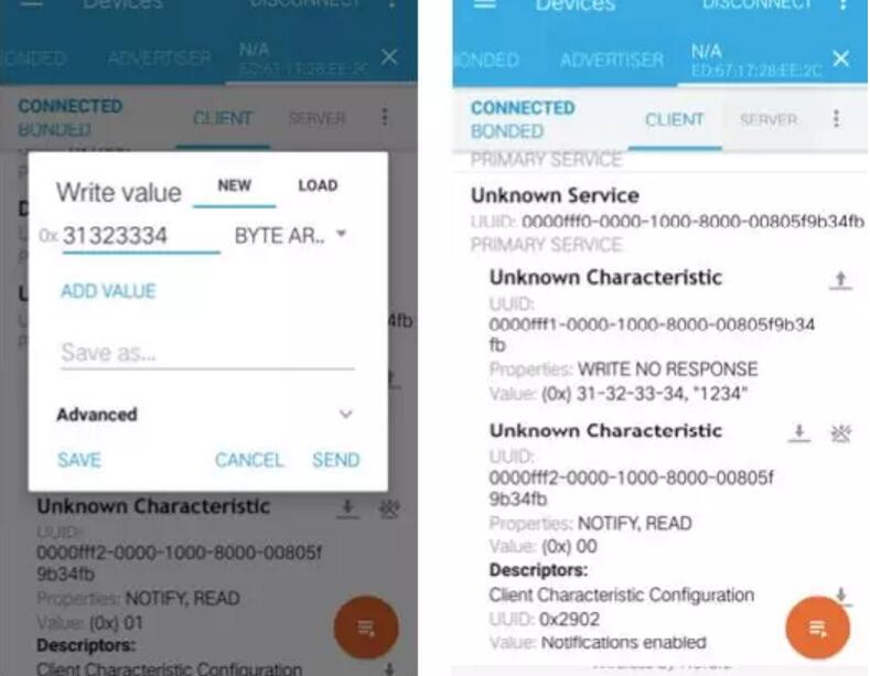 連接成功后,對UUID為fff1的特征值寫0x31323334(模擬用戶輸入密碼”1234”),測試板上連接的馬達開始轉動,執行開鎖動作;