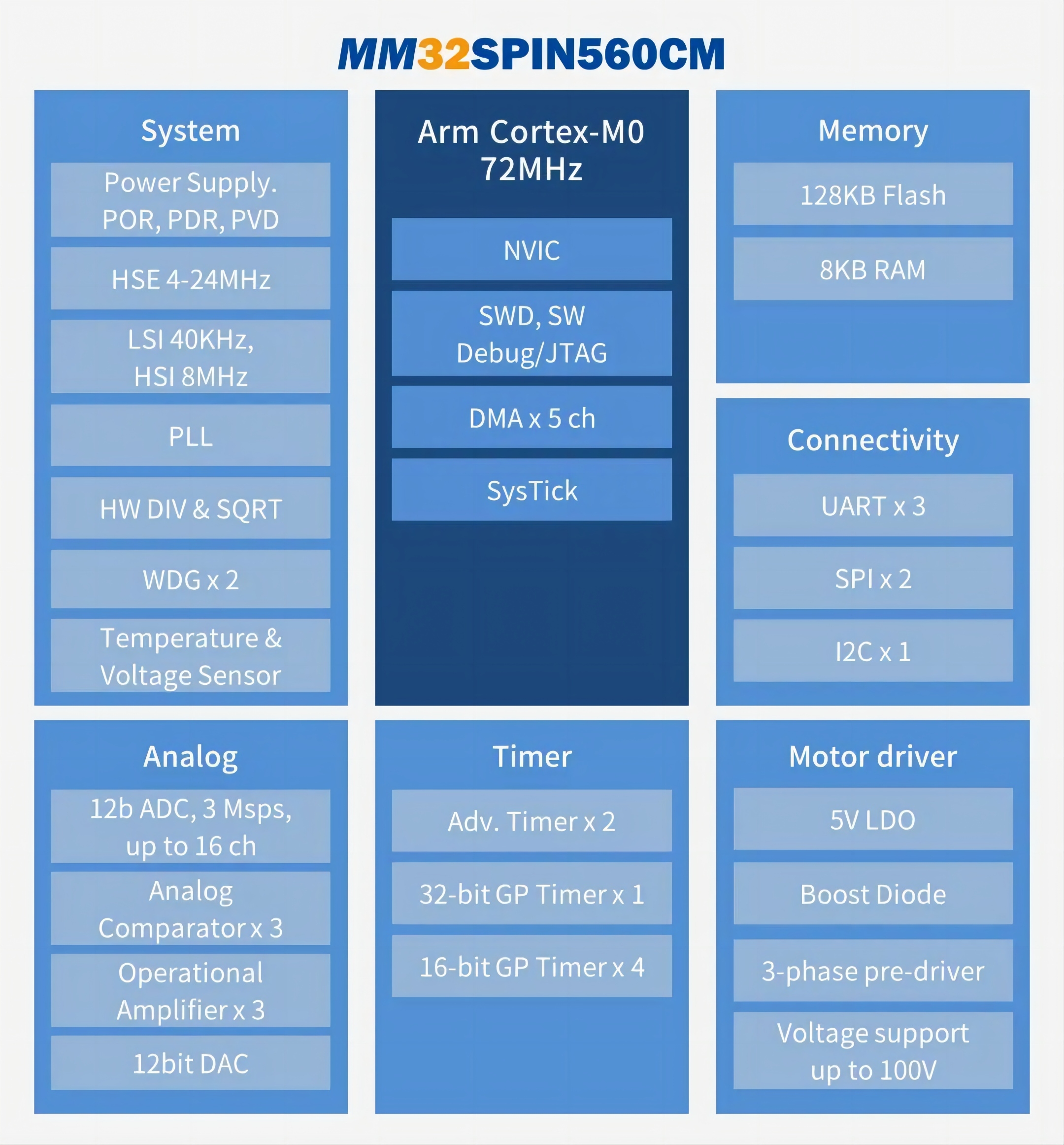 MM32SPIN560CM集成100V耐壓6N預(yù)驅(qū),通過(guò)AEC-Q100認(rèn)證,使用高性能的Arm®Cortex-M0為內(nèi)核的32位微控制器,最高工作頻率可達(dá)72MHz。