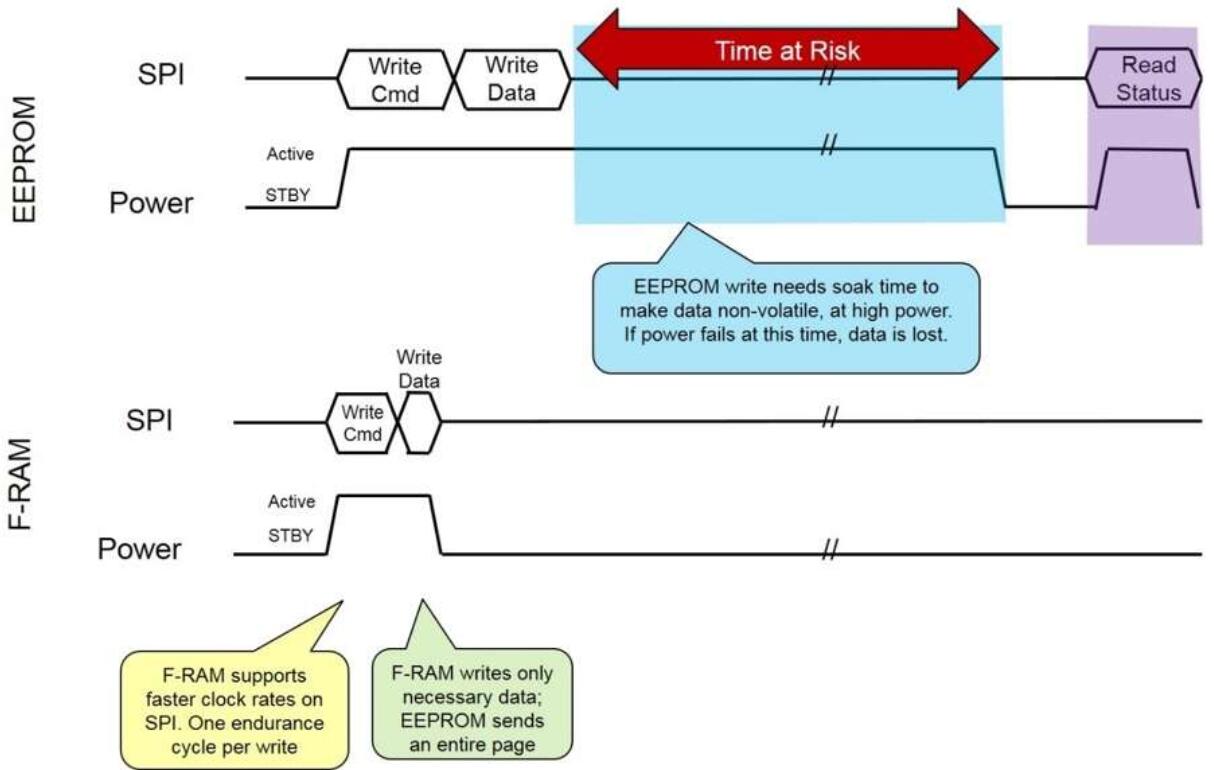 圖2:FRAM的快速寫入速度可保護(hù)使用EEPROM設(shè)備時(shí)可能丟失的關(guān)鍵數(shù)據(jù)。(來源:賽普拉斯半導(dǎo)體)