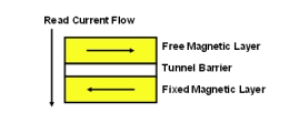 存儲位的置“0”狀態(tài)或置“1”狀態(tài)正是由自由層的極性來確定的。自由層極性和固定層極性一致時(shí)(指向相同方向),穿越MTJ棧層的阻抗很低(請參閱圖1)。自由層極性和固定層極性180度相反時(shí)(指向相反方向),穿越MTJ棧層的阻抗就很高(請參閱圖2)。由MTJ堆棧中的低阻抗和高阻抗來確定是否將位元讀為“0”或“1”。