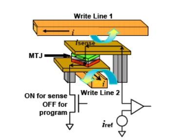 實(shí)現(xiàn)MRAM可靠存儲的一個(gè)主要障礙是高位干擾率。對目標(biāo)位進(jìn)行編程時(shí),非目標(biāo)位中的自由層會被誤編程。目前飛思卡爾半導(dǎo)體研究人員已經(jīng)成功解決了此問題,其方法是,在每次出現(xiàn)位狀態(tài)空翻時(shí),產(chǎn)生一個(gè)跳變位,它將磁矩的方向旋轉(zhuǎn)到同一方向。寫入線1和寫入線2上的反轉(zhuǎn)脈沖電流使極性旋轉(zhuǎn),從而不會干擾相同行或列的其它位元。