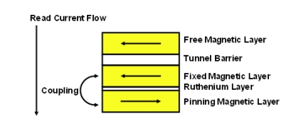飛思卡爾半導(dǎo)體還通過增加兩個(gè)附加層來改進(jìn)固定磁性層。在固定層下面增加了一層釕(Ru)。而在Ru層下面又增加了另一層稱為牽制層(pinning layer)的磁性層。固定層和牽制層的極性相反,將會引起很強(qiáng)的耦合。該強(qiáng)耦合使固定層的極性保持鎖定,因此不會在編程操作過程中引起誤反轉(zhuǎn)(圖4)。