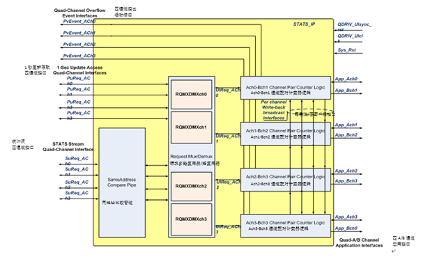 圖2中的STATS_IP架構模塊圖標出了三個子部件:每條通道的同地址比較管道(SACOMP)區塊、請求-復用-解復用(REQ_MXDMX_CHn)區塊以及每條QDR IV應用通道1個的4個A-B通道配對計數器邏輯(ABCH_CTRL_CHn)區塊實例。